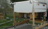 Zwei Wagenheber können in der Stoßstange des Fahrzeugs verankert werden, um es so in die Waagerechte zu bringen und zu stabilisieren. Anschließend erfolgte der Bau des Gestells zum Überwintern der Travelbox (siehe oben, Bild 21/22).