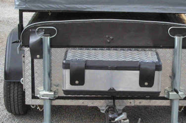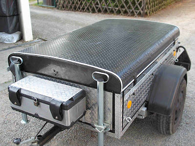 Ich hatte ursprünglich geplant, noch eine kleine Motorradbatterie in den Hänger einzubauen, sie sollte während der Fahrt aufgeladen werden und bei Bedarf das Zelt und den Hänger mit Strom für Licht versorgen. Dazu sollte in die Hängervorderwand und in den Boden des Zeltes je eine 12 Volt Steckdose eingebaut werden. Man bräuchte also nur wenn nötig ein entsprechendes Verbindungskabel einstecken.