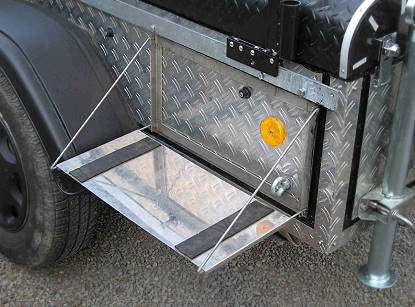 Zuletzt habe ich dann noch eine Kocherhalterung, die ich auch schon vor Jahren gebaut hatte, und die schon am alten Hänger angebracht war, wieder an den "neuen" Hänger montiert. Diese ist zerlegbar und kann mit zwei Handgriffen in den außen an der Hängerwand angeschraubten Edelstahlrahmen eingehängt werden. Sie ist passend für einen Coleman 2-Flammen Benzinkocher. Auch wenn ich am liebsten mit und auf meinem "Luchsfeuer" Hoboofen koche, manchmal verbieten die Umstände aber offenes Feuer. Da hilft dann der leistungsstarke Benzinkocher.