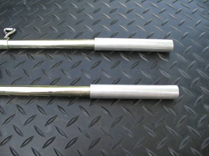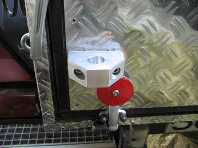 Für die Tarpstangen habe ich zwei Halterungen gebaut, die aus einem massiven Stück Aluminium bestehen. Darin ist je eine Bohrung, ein Sackloch von 22 mm, das in einem bestimmten Winkel sowohl nach hinten als auch etwas seitlich verläuft. Im rechten Winkel dazu zwei 8 mm Bohrungen zum Anschrauben an den Hänger. Die zweiteiligen (15mm/20 mm) Tarpstangen, die im unteren Teil einen Durchmesser von 15 mm haben, bekamen am unteren Ende eine 12 cm lange Hülse aus Aluminium aufgesteckt und verklebt. Diese hat einen Außendurchmesser von 21,9 mm und passt "saugend" in die Bohrung in der Halterung. Zum Aufbauen des Tarps steckt man nun je eine Stange in die Halterung an der Vorderseite des Hängers und eine an die Rückseite an der Heckklappe.
