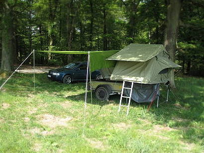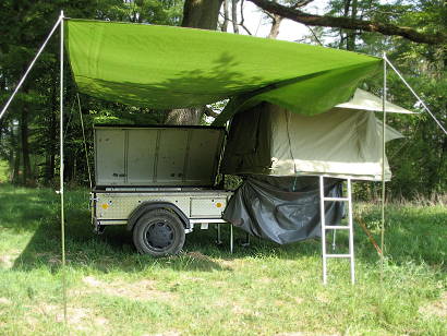 Das aufgebaute Tarp liegt eng an der dem Hänger zugewandten Seite des Zeltes an. Sollte eventueller Regen nicht gerade waagrecht fallen, kann man durch das vorstehende Überdach des Zeltes geschützt, trockenen Fußes das Zelt verlassen und ist mit einem Schritt nach links von der Leiter sofort unter dem Tarp. Bei der von mir verwendeten Plane mit 3 x 4 Metern hat man nun eine überdachte Fläche neben dem Hänger von 2,20 m mal 3 m. Das bietet genug Platz, um einen Campingtisch und 2-3 Stühle trocken bzw. vor der Sonne geschützt unterstellen zu können ...