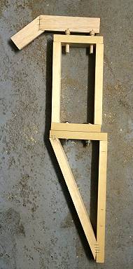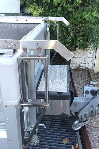 Das ging aber nur, wenn - befestigt an der Hänger Vorderwand -, ein kurzes Stück weiterer Schiene die hinteren Träger des Zeltes aufnehmen kann. Nur so kommt der Deckel frei und lässt sich öffnen. Diese Halterung musste ich zuerst konstruieren und dann bauen lassen. Die Konstruktion habe ich zweiteilig ausgelegt, das Unterteil wird dauerhaft an der Vorderwand angeschraubt, und nur wenn der Einsatz des Zeltes geplant ist, werden die Oberteile mit den Schienenstücken aufgesetzt und verschraubt. Da ich kein technischer Zeichner bin und auch keine Lust hatte, mit dem Schlosser über meine Zeichenfähigkeiten zu diskutieren, fertigte ich nach der wohl nur für mich lesbaren Entwurfsskizze ein 1:1-Modell aus Holz an, das er dann in zweifacher Ausfertigung nachbauen konnte (unten links).