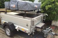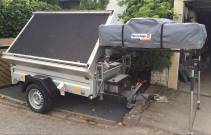 Ich hatte auch überlegt, die Beine des Schiebegestells zu kürzen, um den Schwerpunkt tiefer zu legen. Aber zwei Argumente hielten mich erst einmal davon ab: Zum Einen, dass das nun etwas höher stehende Zelt den Hängerdeckel soweit frei lässt, dass man ihn gut als Ablage, quasi als Stehtisch, nutzen kann. Zum Anderen, ganz pragmatisch, das Einkürzen würde noch einiges mehr an Arbeit verursachen und dann auch noch weitere Schweiß- und Lackierarbeiten nötig machen.