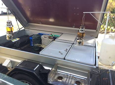 Und da ich gerade bei Beleuchtung bin, innen am Hängerdeckel habe ich über der linken Seite, wo Ausrüstung und Klamotten lagern, eine dreistrahlige Batterie LED-Lampe angebracht, die manuell zu schalten ist. Auf der rechten Seite über der "Küche" und Nahrungsmittelkiste ist eine zweistrahlige Leuchte montiert, die sich auf Annäherung automatisch einschaltet und die, sobald sich niemand mehr im Sensorbereich befindet, nach einiger Zeit selbständig verlöscht.