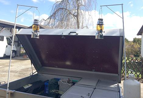 Was also lag näher, als für den neuen Hänger auch gleich Halterungen zu konstruieren, um solche Lampen vernünftig zu befestigen? So baute ich sofort zwei rundum an der Hängerwand ansteckbare Halterungen mit Lampengalgen. Man kann die Lampen so aufhängen, dass die "Küche" und der Bereich vor dem Hänger gut beleuchtet ist. Die Stangen sind teilbar und so kann man sie auch verlängern und die Lampen höher hängen und damit den Lagerplatz großflächiger beleuchten.