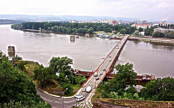 Die erste von der Nato zerschossene Brücke in Novi Sad befand sich im Aufbau. Der Jachthafen ist direkt davor in einem Hafenbecken am linken Ufer. Boote bis 5 m Länge sind da vielleicht gut untergebracht. Wir versuchten an einem schrottreifen, hier verlassen abgestellten Hausboot anzulegen: Sofort kam einer angerannt und verlangte 50 Euro. Wir legten ab und fanden einen kurzen Kopfsteiger in einer kleinen Anlage unterhalb der Brücke im Strom. Da die Pontonbrücke erst Samstagnacht wieder geöffnet wurde, waren wir verschont vom Schwell der Berufsschifffahrt.