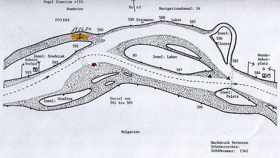Wir hatten den Sommer des Plus gewordenen Minus erwischt: Drei Tage Sonne, vier Tage Regen, Gewitter, Bewölkung, Sturm. Solange die Donau gut betonnt war, hatten wir keine großen Probleme damit, doch wenn jede Art von Markierung fehlte, auch keine Kilometerangaben am Ufer mehr auszumachen waren, wurde die Navigation auf diesem unübersichtlichen Flussstück sehr schwierig. Eine Vielzahl von Inseln standen vor dem Schiff verschwommen in Dunst und Regen. Wo war die Fahrrinne? Verberght schrieb in seinen Karten: Dies war die Fahrrinne 1998, kann heute anders sein. Eine nicht sehr Vertrauen erweckende Aussage. "Es ist noch kein Schiff die Donau runter gefahren ohne Grundberührung", schrieb eine Seglerin in ihrem Reisebericht. Auch keine große Beruhigung. Wir hatten nur einen Vorteil, dass es in den Karpaten stark geregnet hatte und alle Nebenflüsse den Wasserstand der Donau mächtig ansteigen ließen ...