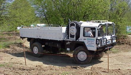 Die Besucher-Attraktion in der Nähe unseres Stands: Neben vielen Parcours im Freigelände ist hier der Lkw-Parcours von Pro-Log, die das ganze Gelände betreiben und offensichtlich ein großes Rad drehen inkl. Management-Incentives (mal Offroad-Lkw-Fahren im Dreck und voll motiviert zurück an den Schreibtisch). Man kann hier mitfahren in den zweiachsigen MAN-Allrad-Lkw - viele nutzen die Möglichkeit, zu dritt vorne im Cockpit ein "Pistengefühl" zu erleben. Auch der zum Verkauf stehende "Paarhunderttausendmark"-Lkw mit Langer&Bock-Ausstattung nutzt die Gelegenheit, zu zeigen was er kann ...