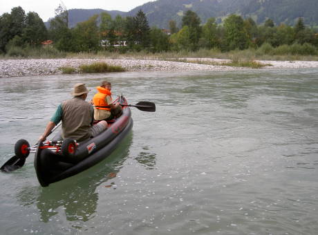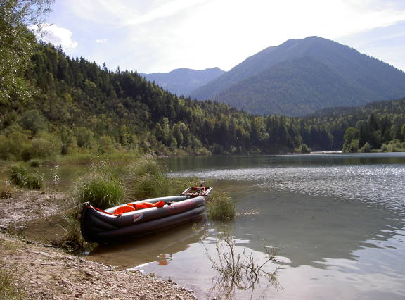 Natürlich zog es uns gleich wieder an den Sylvenstein-Stausee zurück, wo wir unseren ersten Paddelausflug mit dem Leihkanadier gemacht hatten: Uns Vier trug das Boot komfortabel zum gewünschten Ufer, wo wir uns ausgiebig an der Abgeschiedenheit und der Ruhe erfreuen konnten. Im folgenden Sommer erkundeten wir bei mehreren Touren noch den ganzen See und entdeckten dabei traumhafte Badeplätze. Einmal fuhren wir sogar über Nebenarme ein Stück in den Zufluss der oberen Isar hinein. Sohn Tobias und ich sammelten dann später im Herbst noch unsere ersten Erfahrungen auf einem so genannten "Fließgewässer": Bei einer Fahrt auf der Isar zwischen Lenggries und Bad Tölz hatten wir mächtig Spaß und unser Kanadier war so richtig in seinem Element ...