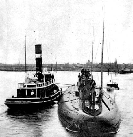 Deutsche Schiffsmakler verkauften die Ladung des U-Boots mit riesigem Gewinn; angeblich für mehr als das Vierfache der Gesamtkosten des Baus der DEUTSCHLAND. Unser Bild (oben Mitte) zeigt das erste Handels-Unterseeboot der Welt beim Verlassen des Hafens von Baltimore, unterstützt von einem Hafenschlepper - auf dem Rückweg nach Deutschland und beladen mit einer Fracht, zu der 348 Tonnen Kautschuk, 341 Tonnen Nickel und 93 Tonnen Zinn gehörten.