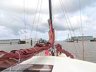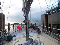 Die Schleuse ist für 08:00 Uhr bestellt, Hafenmeister Frank kommt pünktlich. Bis dahin warten wir in sicherem Abstand vor dem großen Schlickberg, der sich kurz vor der Schleuseneinfahrt unter Wasser befindet. Passend dazu schläft der Wind ein und wir können problemlos treiben. Der Schlickberg wird dann mit Schwung passiert: Dazu muss man zuerst die Zufahrt in den Yachthafen ansteuern, um dort dann das Boot mit einer schnellen Wende und Schwung wieder zur Schleusenzufahrt zu bringen. Die Schleusung selbst dauert nur 10 Minuten, da gerade Hochwasser ist ...