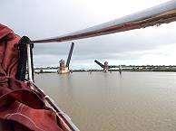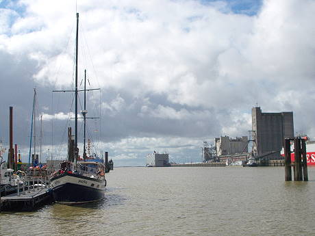 Schließlich geht es mit reduzierter Motorleistung weiter, dazu nutzen wir die ablaufende Tide. Das erste Ziel ist Emden: "Emsbridge", die Brücke bei Leer, will eine Stunde vor Erreichen über die geplante Passage informiert werden. Das klappt und wir haben dadurch keine Wartezeit.