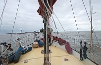 Die Tide läuft ab, bereits um 11:40 Uhr passieren wir die Fischerbalje und sind auf der Ems. Um 14:20 Uhr haben wir das Riffgat erreicht, nach Passieren des Windparks liegt die Nordsee vor uns. Zbigniew hat für die Meeresgötter ein Glas guten Rums in die Nordsee gekippt - für eine gute Reise. Wir werden sehen ..!