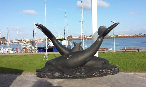 dahin entdecken wir noch die Skulptur der beiden eher unglücklich landenden Delphine