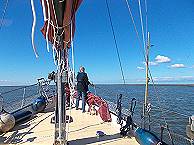 Auf der Rückfahrt nimmt der östliche Wind wieder bis auf 4-5 Bft zu und bläst schließlich von vorn: Wir müssen die Segel bergen. Ein sehr schöner Tag, fast keine Wolken, aber kreuz und quer laufende Wellen - der Motor muss wieder ran. Bis kurz vor dem Windschutz vor der Insel Borkum erreicht das Gehoppel eine Wellenhöhe von 1,5 m. Unsere pacifico nimmt dabei kein Wasser, auch kein Spritzwasser: Das Deck bleibt trocken.