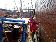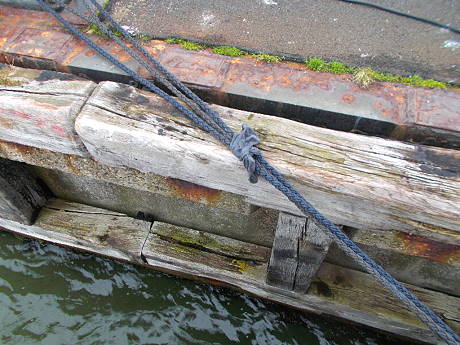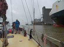 Wir müssen einen weiteren Tag warten: Unsere Leinen werden wegen des zunehmenden Windes und dem damit verbundenen Schwell mit Lappen gegen Durchscheuern gesichert. Eine regelmäßige Überprüfung der Leinen muss aber trotzdem stattfinden, da wir keine unangenehme Überraschung erleben wollen. Die Kanten der alten Kriegsschiffpontons sind durch Verwitterung und Bruch ziemlich rau und kratzig geworden.