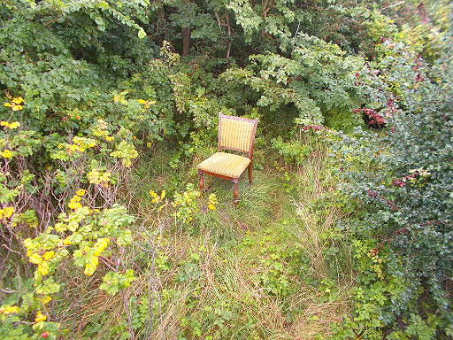 Während des Morgenspaziergangs mit Loona treffen wir dieses Mal - einen Stuhl im Grünen. Sachen gibt´s! Der Stuhl steht einsam und allein in einer nicht leicht einzusehenden Nische im Buschwerk. Da er sehr sauber und trocken ist, kann er da eigentlich noch nicht lange stehen. Doch niemand ist zu sehen. Da wir keine Lust zum Sitzen haben, gehen wir bald weiter.