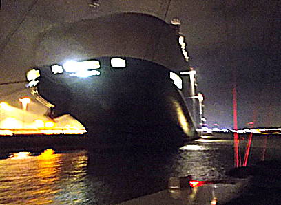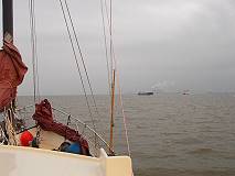 Kurz nach 21:00 Uhr laufen wir bei der Tonne 44 ins Hauptfahrwasser ein: Zbigniew und Jürgen fahren oben, Simone hält Loona unten ruhig. Ab der Fahrwassertonne 57 kommen dann Wind und Wellen von vorn - ein Meter Seegang. Um 22:45 Uhr laufen wir schließlich in den Emder Außenhafen ein. Es regnet leicht und der große Autotransporter gleich bei der Einfahrt gibt nur ein unscharfes Bild ab ...
