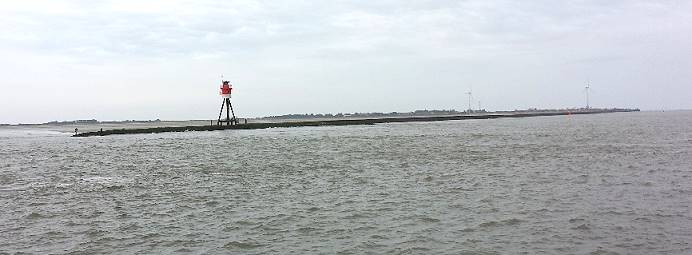 Außerhalb der "roten" Fahrwasserseite fahren wir emsaufwärts. Dadurch bleiben wir dem Durchgangsverkehr fern. Trotzdem müssen wir wachsam sein: Immer wieder sind hier an schnell wechselnden Stellen Messbojen zur Strömungsmessung ausgelegt - kleine Kugeln mit langer Antenne. Wenn diese bereits länger im Wasser sind, haben sie nicht mehr die helle Farbe, mit der man sie bei Tag leicht sehen kann.