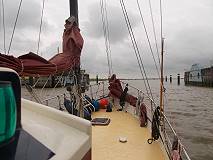 Die Anleger des Emder Yachtclubs sind gut besucht und liegen in fast völliger Dunkelheit. Wir entschließen uns deshalb, am Zollponton anzulegen. Wieder Wind von vorn - das geht gut und ruhig. Kaum ist der Motor aus, will Loona nach oben, also raus mit ihr.