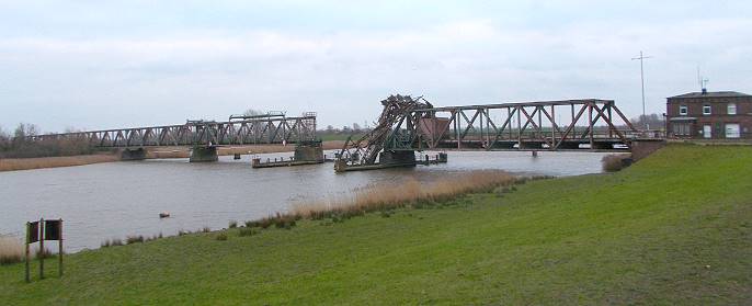 In dieses Mittelteil ist der Frachter bei ablaufendem Wasser hinein gefahren. Nun ist das Mittelteil also zerstört und die gesamte Brücke verzogen - Totalschaden (siehe Bild unten). Die Brücke ist sehr alt und war bisher eher schon ein Fall für das Technikmuseum. Die Bahnverbindung zwischen dem niederländischen Groningen und Leer, die über die Brücke führt, war bis 1975 Teil der kürzesten Bahnverbindung von Hamburg und Amsterdam, hat aber mittlerweile keine große überregionale Bedeutung mehr. Nun muss sie komplett neu gebaut werden ...