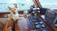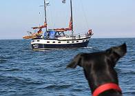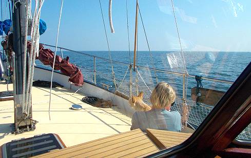 Loona ist - wie immer - komplett aufgeregt, pausenlos. Immerhin entwickelt sie Interesse an ihrer Umgebung: So wird nun auch einmal über den Steuerstand geschaut, um zu sehen, was da so passiert. Dann geht es ab und zu mal an Deck auf einen Spaziergang oder einfach nur, um die warme Sonne zu genießen. Etwa 3 Stunden vor Erreichen der Norderney-Ansteuerungstonne gesellt sich ein großer Katamaran zu uns. Leider hält es der Schiffsführer mit dem Abstand nicht so genau: Immer wieder fährt er in unseren Nahbereich hinein, so können wir nicht in Ruhe gleichmäßig fahren. Inzwischen sind auch Christoph und Lotte wieder bei uns und fotografieren ...