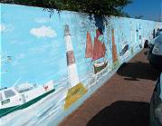 Auf unserem Weg in die Stadt laufen wir erst einmal den ganzen Hafen entlang: Ein Künstler hat einen großen Teil der Hafenmauer mit den Bildern der Schiffe bemalt, die einst oder auch jetzt noch den Norderneyer Hafen anlaufen. Ähnlich, wie es in den internationalen Yachthäfen von den Besucheryachten aus der ganzen Welt praktiziert wird. Nur die gezeigten Leuchttürme gibt es hier nicht, denn das sind Türme, die nur an den Küsten zu finden sind.