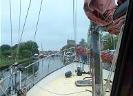 Um 10:05 Uhr passieren wir das Sperrwerk und um 11:30 Uhr die Leer Bridge. Vor der Brücke müssen wir erst noch 15 Minuten auf eine weitere Yacht warten, danach lassen wir uns Zeit. Zbigniew meldet sich wieder: Er hat wirklich nur einen Liegeplatz von 15 m Länge zusammen bekommen. Bei unseren 13 m Bootslänge heißt das "Einparken ohne Hilfe des Motors". Harry von der Arielle und Zbigniew wollen uns mit den Leinen einfangen und in die Lücke bugsieren. Weener ist bereits in Sicht, wir lassen uns von der Tide flußaufwärts schieben und nehmen den Motor nur zum Steuern ...