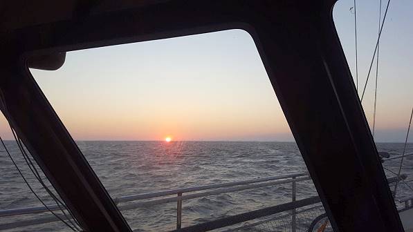 Mit unseren Augen und dem alten, aber aktuellen Kartenplotter A 65 geht es durch die Dunkelheit: Wir halten möglichst die Mitte des Fahrwassers, das uns der Plotter sehr genau anzeigt. Wir kommen nach etwa einer halben Stunde an der Zufahrt zur Ems an, ohne eine unbeleuchtete Fahrwassertonne unfreiwillig näher kennengelernt zu haben. Gegen 06:00 Uhr kommt dann der erste Schimmer des neuen Tages bei der Emstonne 27 in Sicht. Der Wind hat inzwischen eine leicht südliche Tendenz mit EzS 4 bei etwa einem Meter Seegang.
