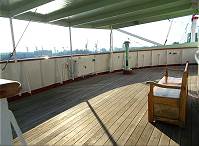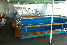Vom ehemaligen Passagierdeck, dem heutigen Hoteldeck, geht es nach draußen in den Sonnenschein: Hier, am hinteren Abschluss des Aufbaus, befindet sich der Pool. Leider sind hier noch Restaurationsarbeiten im Gange. Die Deckstühle für die vielen Gäste im Jahr liegen noch zusammengeklappt am Aufbau ...