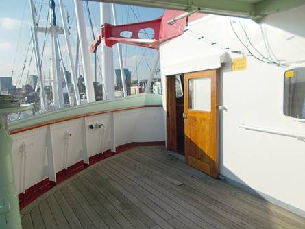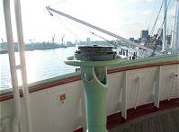 Der Weg führt nun zurück zum Backbord-Zugang der Kommandobrücke: Der Pfosten dort ist der Träger der "Tochteranzeige" vom Magnetkompass der Kommandobrücke. Die Holzbank gehörte ursprünglich nicht zur Ausstattung, denn sie ist ohne jede Befestigung. Zur Fahrenszeit des Schiffes auf dem Atlantik musste alles fest angebaut sein. Den Besuch der Kommandobrücke verschieben wir auf morgen.