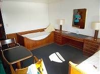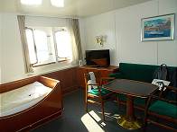 Die ehemalige Passagierkabine lässt keine Wünsche offen: Es ist alles vorhanden in der funktionierenden Technik der damaligen Zeit. Natürlich gibt es aber auch aktuelle Technik: Etwa einen Kühlschrank, modernes TV und WLan. Die Heizung wird, wie immer auf solchen Schiffen, über die Belüftung geregelt und funktioniert einwandfrei. Ein Bad mit Wanne und Duscheinrichtung im originalen Design rundet die Kabine ab.