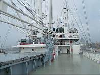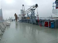 Wir gehen zurück an Deck: Inzwischen kommt viel Feuchtes von oben. Ein letzter Blick auf das Achterdeck und es geht etwas schneller nach vorn zum Bug auf das Backdeck. Das Schiff ist in einem guten Zustand!