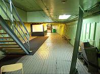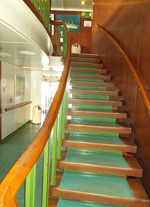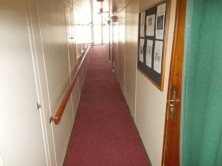 Doch zuvor erst einmal zurück nach unten zum hinteren Hauptdeck: Wir holen unser Gepäck und begeben uns ins Innere des Schiffes. Der Weg zu unserer Kabine führt nach oben über eine Art Freitreppe zum ehemaligen Passagierbereich. Dort, im Backbord-Seitengang, befindet sich die Tür zu unserer Kabine. Ein Blick entlang des Gangs zeigt den achtern liegenden Ausgang an Deck ...