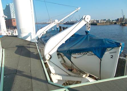 Dieses Deck ist auch das Bootsdeck, hier werden bei Bedarf die Rettungsboote bestiegen. Weiter geht es ein Deck höher zur Kommandobrücke: Oben angekommen, zeigt der Blick zurück das Backbord-Rettungsboot (auf der linken Schiffsseite) von oben.