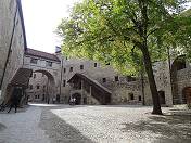 Der Weg nach oben endet im ersten von fünf Vorhöfen hinter der Hauptburg, zu der wir für unseren Rundgang vorgehen (siehe dazu auch unsere bei Tripline erforderliche Ergänzung "Darstellung Burgbesuch"). Die Hauptburg stammt aus dem Hochmittelalter, als sie unter der Herrschaft der Wittelsbacher massiv ausgebaut wurde. Hier befindet sich unter anderem auch das Burgmuseum. Die beste Darstellung der Gesamtanlage einschließlich aller Vorhöfe findet sich auf der Webseite der Burg unter https://www.burg-burghausen.de/deutsch/hoefe/index.htm