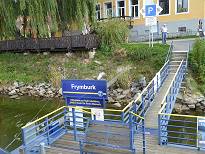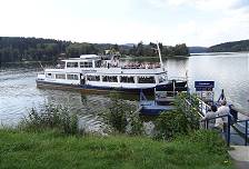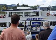 Vorbei an sehr individuellen Kleingärten erreichen wir die Schiffsanlegestelle, von der aus wir eine Rundfahrt auf "unserem" Stausee machen wollen: Das nach dem in Böhmen geborenen Adalbert Stifter, der häufig Frymburk besuchte, benannte Schiff der Lipno-Line bietet die Möglichkeit dazu: https://www.lipno-line.com/ships?lang=de