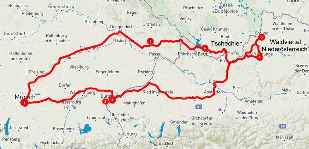 Da dies unser erster Testbeitrag mit "tripline" ist und wir diesen Rundkurs auch auf der Karte "ordentlich" darstellen möchten, haben wir als Ausgangspunkt ganz einfach "München" angegeben, obwohl wir etwas im Osten davon angesiedelt sind. Um Anfangs- und Endpunkt in der Grafik nicht übereinander zu legen, haben wir als Endpunkt dann noch den Münchner Hauptbahnhof ausgewählt, den wir zum Tourende zwar nicht ansteuern wollen, der uns aber von tripline u.a. als Punkt neben "München" zusätzlich angeboten wurde. Nun also auch in unserer Kartenübersicht ein Rundkurs - geht doch, oder?