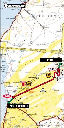 Die beiden Ergs, die letztes Jahr einigen Teilnehmern so schwer zu schaffen machten, werden vermieden, aber die Piste nach Atar ist steinig. Achtung vor Reifenpannen und deren Folgen - jetzt wo die Rallye fast zu Ende ist - und vor allem, wenn der Vorsprung nur gering ist.