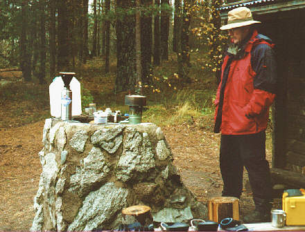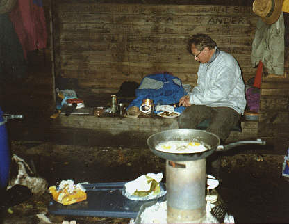 Nun denn, raus aus dem Schlafsack. Immer noch diesig aber weiterhin mild. Erst einmal im Bach frisch gemacht und dann sofort den Ofen angeworfen und Kaffe gekocht. Während Thomas schon anfing, langsam alles wieder ein- und aufzuräumen, machte ich mich an die Zubereitung des Frühstücks.