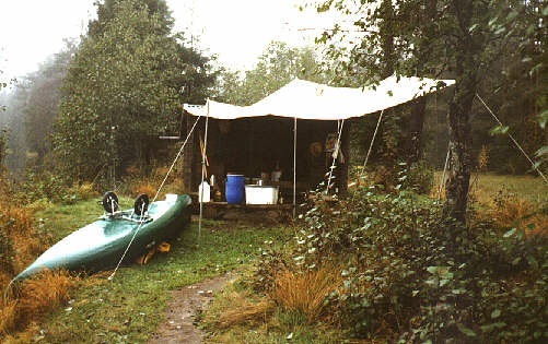 Mann, unsere geheimen Wünsche wurden erhört! Wir hatten nicht wirklich Lust, bei diesem Wetter und im Dunkeln noch unser Zelt aufzubauen. Die nun schon eingeübte Montage des Tarps ging flott von der Hand und schon waren wir wieder im Spiel! Und es schüttete erneut recht ausdauernd. Wir aber ließen es uns gut gehen und diesmal gab es Spiegeleier mit Speck und noch ein paar Brote. Ein Bier und zwei "Fettkiller" brachten uns bald wieder in die Nähe der Schlafsäcke: So den ganzen Tag an der Luft und die zurückgelegten Paddelkilometer machten sich doch bemerkbar. Und auch in dieser Nacht brauchten wir nicht zu frieren ...