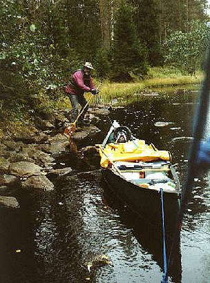 Hinter der ersten Kehre wurde der Wasserlauf zuerst immer enger und dann, was war das? Nach weiteren 20 m war alles voller Steine und Baumstämme. Hmmm? Wir kehrten um und nahmen den zweiten Arm. Auch hier kamen wir nicht viel weiter - er endete genau wie der andere in einem Blockfeld. Das konnte nicht nur mit herbstlich niedrigem Wasserstand erklärt werden! Wir waren schlicht und ergreifend im falschen Gewässer - hätte ich doch nur bei der Vorbesichtigung etwas genauer hingeschaut. Ich hatte ja sogar einen dort in der Nähe wohnenden Schweden gefragt. Aber "Nichtkanuten" sehen das wohl alles etwas anders? Es half nichts, also wieder zurück, raus aus dem Boot und erst mal alles an Land gezogen.