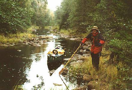 Gut gelaunt starteten wir einen erneuten Versuch. Nach einer halben Stunde wurde es plötzlich wieder immer enger und enger und ... NEIN! ... das konnte doch alles nicht wahr sein - Verblockung und schon sichtbare Steigung auf den nächsten 100 m. Aber jetzt waren wir schon mal hier, also wie war das noch mit Treideln?! Wir ackerten wie die Blöden und wuchteten unseren Lastkahn durch die Schwellen und über die Steine und schon es ging weiter. Bis zur nächsten Kehre. Auweia, das war´s ja wohl endgültig: Der Fluss hatte plötzlich auf den nächsten 100 m schon gut 1,5 m Steigung und bestand nur noch aus schmalen Rinnsalen und Steinen. Und überhaupt, was paddeln wir hier eigentlich stromauf. Verdammt!?
