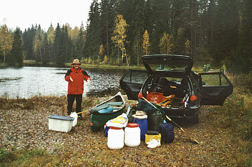 Am Sonntag Morgen, den 7. Oktober, war es dann so weit: Zuerst wurde mein Wagen an der geplanten Aussatzstelle geparkt und dann ging es mit Thomas´ Auto weiter zur Einsatzstelle. Trotz meiner voran gegangenen Beschwörungen diverser Wettergötter und obwohl sogar der offizielle Wetterbericht eigentlich etwas freundlichere Bedingungen prophezeit hatte, war es nun doch ziemlich diesig und die Wolken hingen fast in den Bäumen. Aber es war nicht kalt und so dauerte es nicht lange, und wir saßen nach einer kleinen Sortierorgie endlich im Boot ...