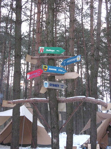 Als ich mich eingerichtet hatte (diesmal ohne vorheriges Freischaufeln, es reichte ein wenig den Schnee platt zu trampeln), fiel mir auf, dass es in diesem Jahr anscheinend mehr Lavvus gab. Aber vielleicht kam mir das auch nur so vor. Und was noch auffiel: Es gab nun einen echten Schilderbaum!