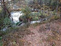 Ein neuer Tag bricht an: Heute werde ich mir die Aschauteiche ansehen, in denen nachhaltige Fischzucht betrieben werden soll. Das Wort Aschau ist hier der Name für einen kleinen Wasserlauf, die Aschau, welche die Zuchtteiche mit Wasser speist. Diese Teiche selbst dienen außerdem als Wasserreservoir für mögliche Waldbrände hier. Die Karte auf dem Bild oben rechts zeigt (in Rot) die 9,6 km lange Route, der ich zur Besichtigung der Anlage folgen möchte.