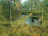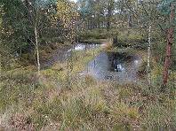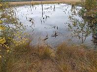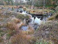 Nach etwa zwei Stunden habe ich den Weg durch das Moor geschafft, hinsichtlich der kommenden Nacht kenne ich mich nun ganz gut aus. Viele Baumstümpfe in den Wasserflächen zeugen vom ehemaligen Bewuchs. Dazu sei gesagt: In Mooren sind Bäume unerwünscht, weil sie zu viel Wasser aufnehmen, das vom Moor selbst zur Erhaltung gebraucht wird. Die Reste dieser Bäume im Wasser stammen aus einer Zeit, in der man das auf weiten Flächen trockengelegte Moor wieder renaturieren wollte - jedoch nicht als Moor. Später fiel dann doch die Entscheidung, das ehemalige Moor wieder aufleben zu lassen. Ich ziehe mich nun auf meinen Parkplatz zurück und warte auf den Einbruch der Dämmerung ...