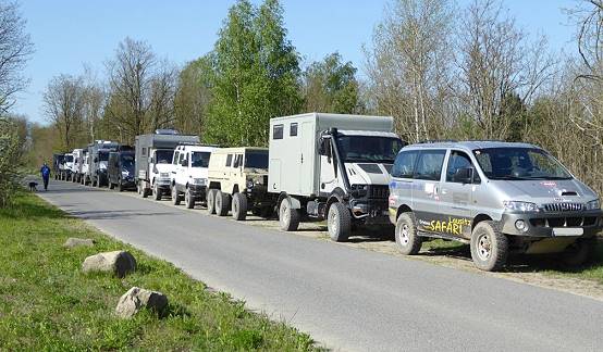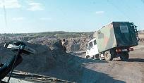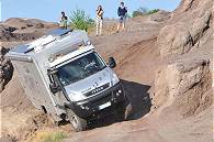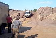 Langsam neigt sich unser abwechslungsreicher Fahrtag dem Ende zu, doch die letzte Steilkurve bietet noch einmal ungeahnte technische Schwierigkeiten und hätte beinahe zu einem Desaster geführt: Unser Guide Oliver kennt diese Kurve wohl schon von früheren Führungen und mahnt zur Vorsicht. Doch im Gegensatz zu den üblicherweise hier entlang geführten Geländewagen haben unsere schweren und großen Fahrzeuge einen größeren Wendekreis und deutlich höheren Schwerpunkt. Dies erfordert manchmal eine etwas andere Fahrtechnik, wie sich besonders hier zeigt.