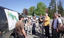 Am Bahnhof von Welzow sammeln wir uns zu einem kurzen "briefing" und Oliver erklärt die Region des aktuellen Tagebaus Welzow sowie unsere heutige Tour, die uns mitten ins Herz des Kohleabbaus und an die derzeitige Abbaugrenze führen soll. Dann fahren wir hinter ihm her zu den öffentlich zugänglichen Aussichtspunkten und später durch mehrere Absperrungen weiter ins Innere des Reviers.