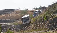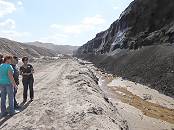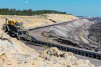 Unten angekommen staunen wir nicht schlecht über das 13 Meter hohe Braunkohlenflöz, das sich direkt vor uns aufbaut und nur deshalb nicht weiter abgebaut werden kann, weil die Stadt Welzow nördlich davon in geringer Entfernung darauf steht und bisher noch nicht geräumt werden konnte. Die Braunkohle, die hier liegt, sieht eher wie Holzkohle aus, ganz anders als die Steinkohle des Ruhrgebietes oder die oberbayrische Pechkohle. Man muss sie wegen des hohen Wassergehalts erst energieaufwändig trocknen und zu Staub mahlen, damit die Brennöfen der Kraftwerke optimal beschickt werden können. Etwa ein Drittel des Energiegewinns wird benötigt für Förderung und Trocknung ...